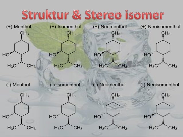 - 2. Dalam senyawa alami, struktur isopropil berorientasi pada isomer trans pada gugus metil dan hidroksil, sehingga dapat digambarkan sebagai berikut: Enantiomer (+) dan (–) mentol adalah yang paling stabil antara semuanya berdasarkan konformasi sikloheksan.